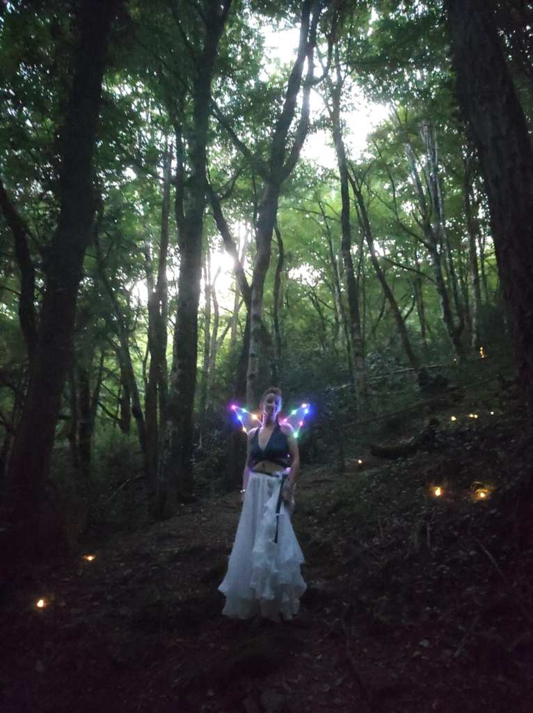 Un sentier illuminé dans les bois à la rencontre de personnages féériques
